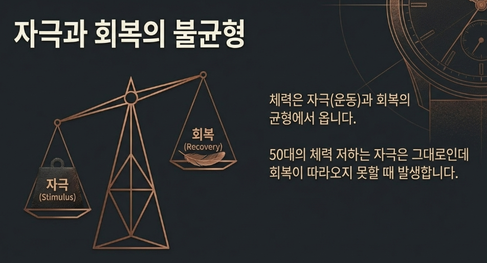 50대에는 자극은 유지되는 반면 회복 속도가 이를 따라가지 못해 만성 피로로 이어질 가능성이 큽니다.