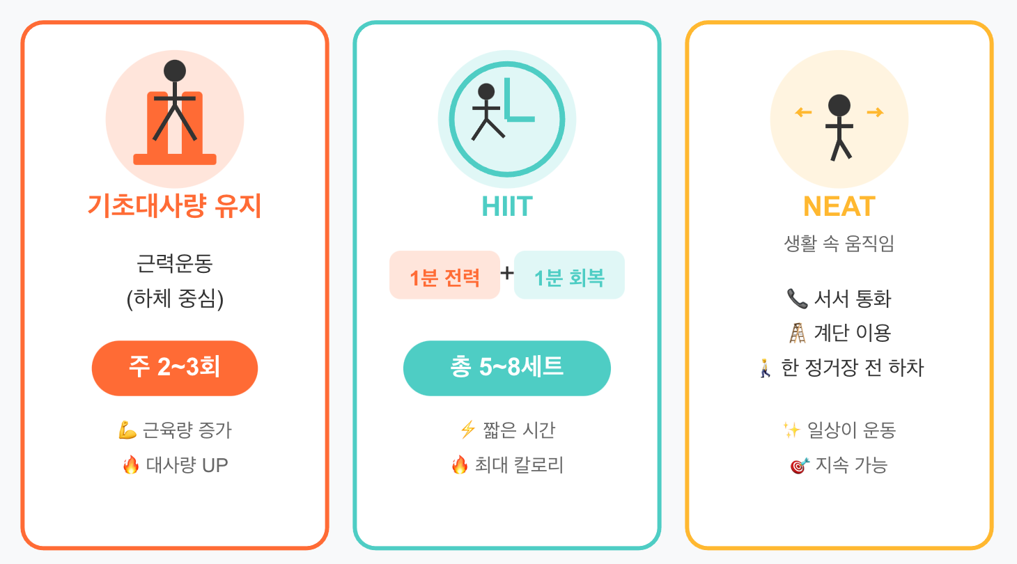 - 기초대사량: 근육량이 핵심. 주 2~3회 전신 근력(하체 대근육)으로 방어·증가.