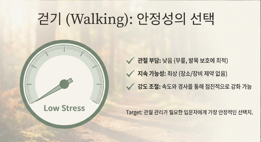 걷기는 달리기에 비해 충격이 낮습니다. 무릎과 발목에 가해지는 부담이 상대적으로 적어 장기적으로 지속하기에 적합한 운동입니다.